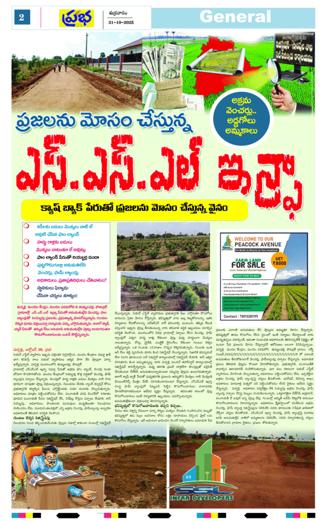 మర్పల్లి మండల కేంద్రం, మండల పరిధిలోని ని తుమ్మలపల్లి, పొట్లూర్ గ్రామాల్లో ఎస్ ఎస్ ఎల్ ఇన్ఫ్రా పేరుతో అనుమతుల్లేని వెంచర్లు, ఫాం ల్యాండ్లతో రియల్టర్లు ప్రజలను, ప్రభుత్వాన్ని మోసగిస్తున్నారు. గుంటల లెక్కన భూమి విక్రయిస్తూ సర్కారుకు పన్ను ఎగ్గొడుతున్నారు. అలాగే క్యాష్ బ్యాక్ పేరుతో తక్కువ రేటు ఆశచూపి అనుమతుల్లేని ప్లాట్లు అంటగడుతూ కొనుగోలుదారులను బురిడీ కొట్టిస్తున్నారు.